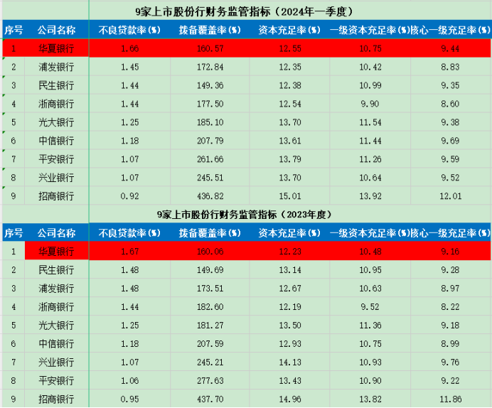 财报数据显示,截至去年底,华夏银行的不良贷款率高达1.67%,位居9家股份制银行之首,这种情况延续到今年一季度;而拨备覆盖率则仅好于民生银行,为160.06%。