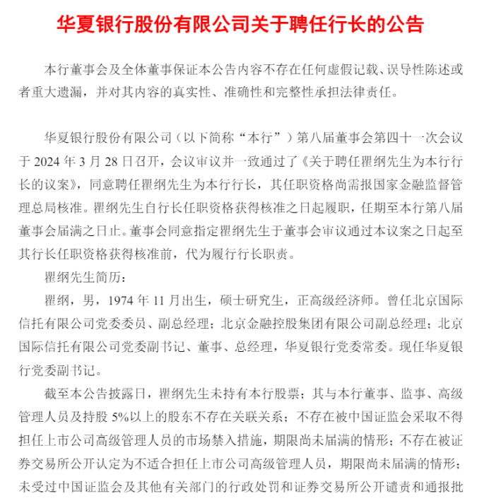 一直到3月30日,华夏银行发布公告称,经由该行董事会3月28日审议通过了《关于聘任瞿纲先生为本行行长的议案》,同意聘任瞿纲为华夏银行行长,不过其任职资格尚须报国家金融监管总局核准。