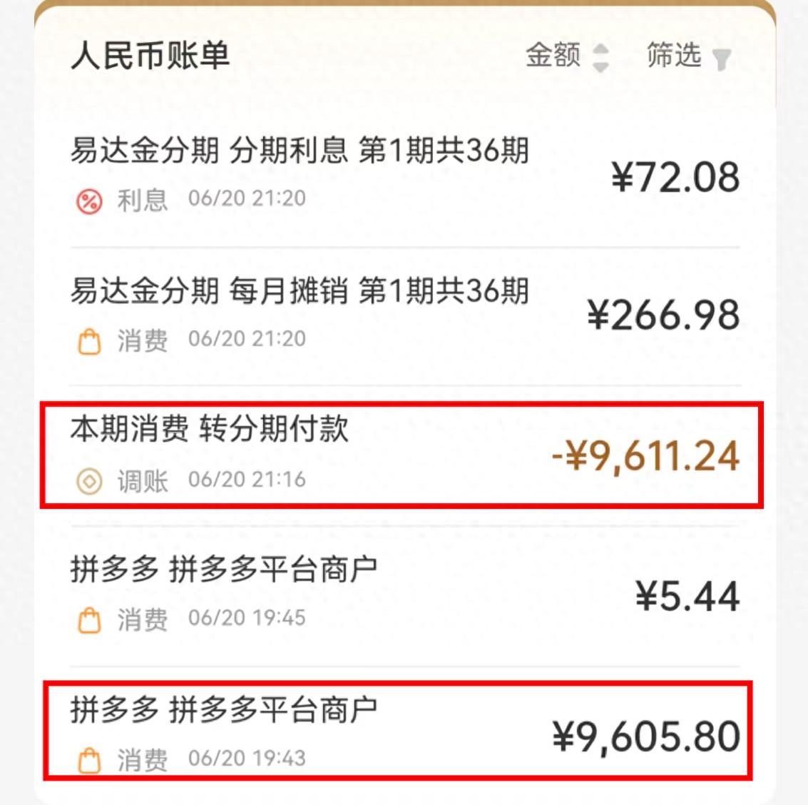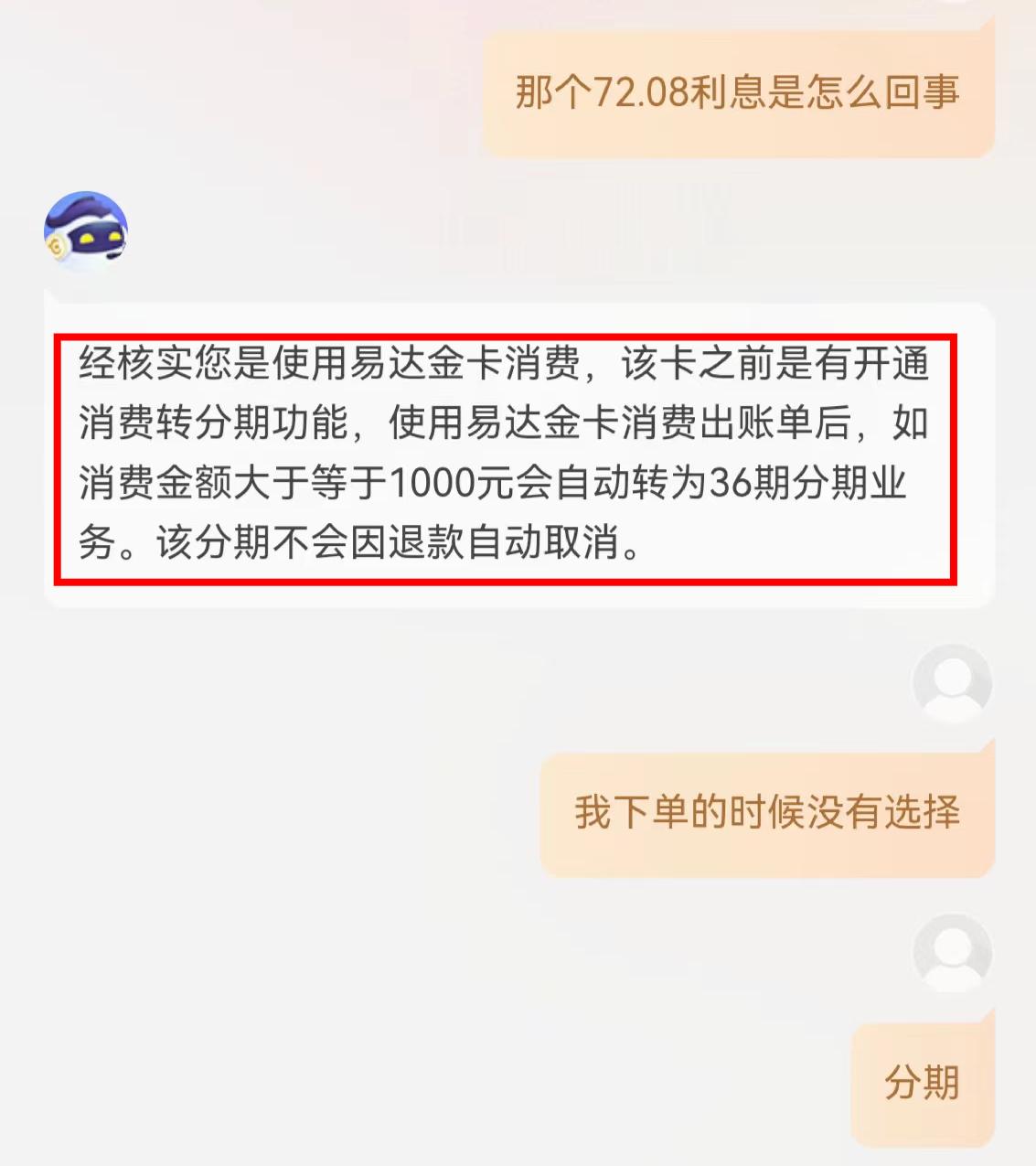 陈先生认为,“转分期付款”说明自己并未进行分期操作,而是系统自动转为分期。随后他与华夏银行客服沟通。对方表示,陈先生使用的是易达金卡消费,该卡具有开通消费转分期功能,如消费金额大于1000元就会自动转为36期分期业务,且不会因为退款自动取消。