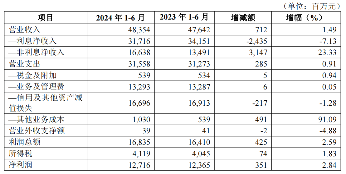 近日,华夏银行(600015.SH )披露了2024年半年度报告。报告期内,公司实现营业收入483.54亿元,同比增长1.49%;归母净利润124.6亿元,同比增长2.86%;扣非净利润124.21亿元,同比增长3.47%。