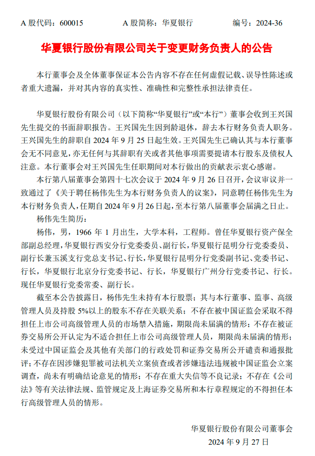 据公告显示,华夏银行聘任杨伟为该行财务负责人,原财务负责人王兴国因到龄退休辞任。杨伟现任华夏银行党委常委、副行长,在华夏银行现任副行长中排位居前。