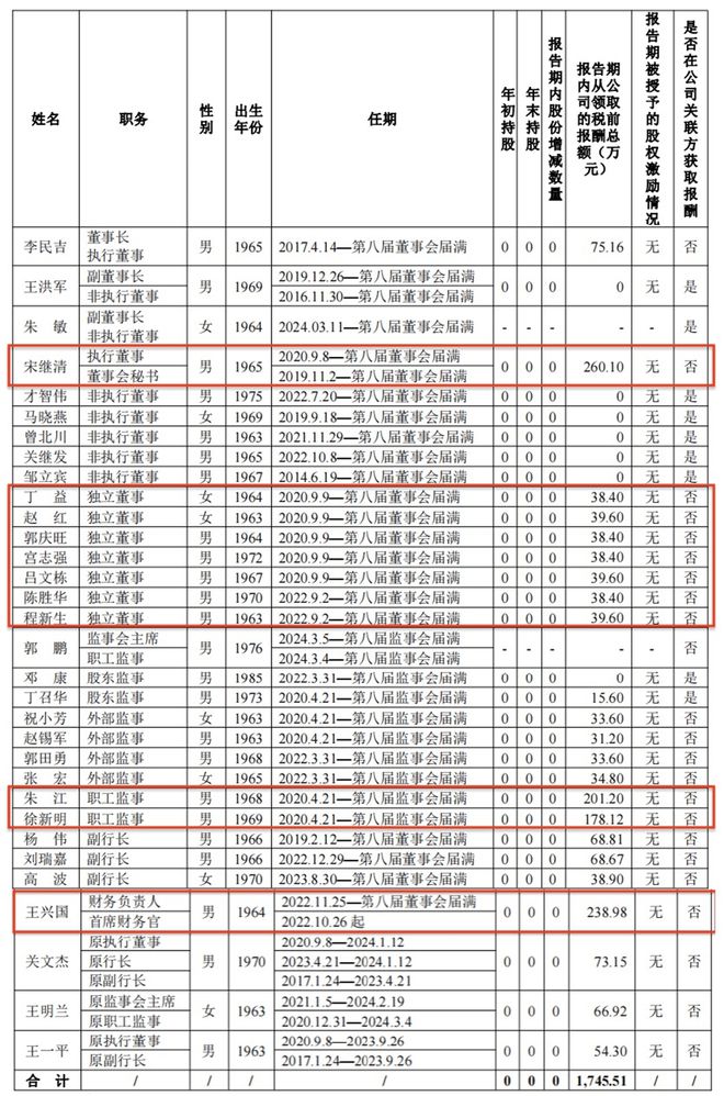 高管薪酬方面,根据2023年年报所披露的数据,全体董事、监事和高级管理人员从该行领取的税前报酬合计 1745.51万元,同比增长1.47%。目前,华夏银行高层中薪酬最高是执行董事兼董秘宋继清,超过260万元,还有3位高层薪酬超过百万元,他们分别是职工监事朱江(201.2万元)、职工监事徐新明(178.12万元)和此次退休离任的王兴国(238.98万元)。另外,该行一众独立董事薪酬也并不低,年薪大约都在40万元左右。