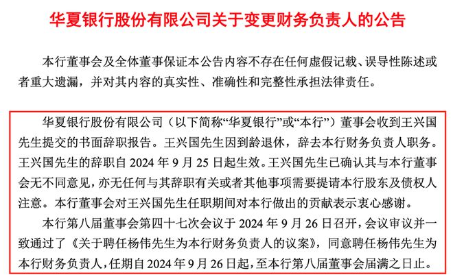9月26日晚间,华夏银行连发两则重要公告,先是披露了关于变更财务负责人的公告,公告显示,董事会收到王兴国因到龄退休而提交的书面辞职报告,辞去华夏银行财务负责人职务,自9月25日起生效,董事会对王兴国任职期间对华夏银行做出的贡献表示衷心感谢。