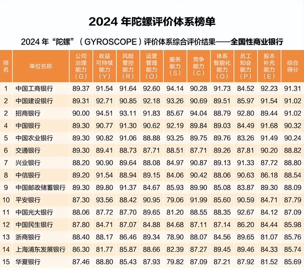 中国银行业协会发布的衡量银行稳健发展能力相关榜单,最近发布的2024年度商业银行稳健发展能力“陀螺”评价结果显示,在15家全国性商业银行中,2024年华夏银行的“陀螺”评价体系综合评分为85.69分,是15家中最低的。