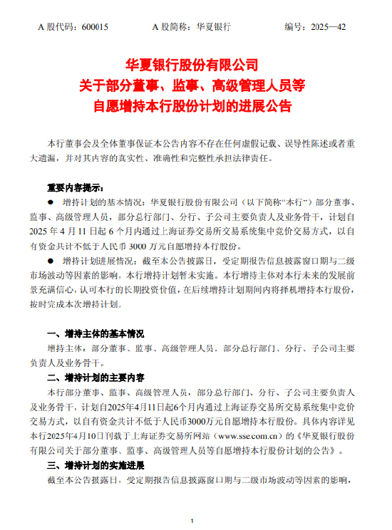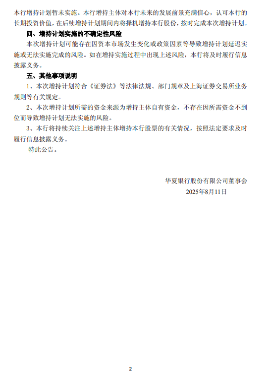 此次增持计划涉及人员包括部分董事、监事、高管,以及总行部门、分行和子公司的主要负责人与业务骨干。公告强调,增持资金均为自有资金,不存在资金不足风险,但可能因市场或政策变化导致计划延迟或调整。华夏银行承诺将按规定履行后续信息披露义务。