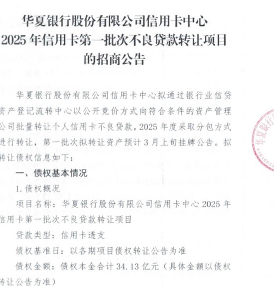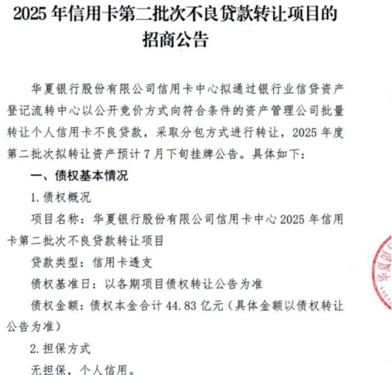 7月16日,根据银登网公开信息,华夏银行股份有限公司信用卡中心发布2025年信用卡第二批次不良贷款转让项目的招商公告。