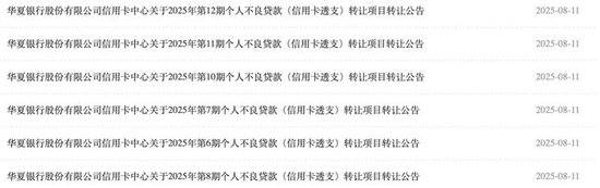 7期资产包、合计未偿本息超百亿元、涉及借款人超20万名,华夏银行股份有限公司信用卡中心2025年第6-12期个人不良贷款(信用卡透支)转让项目集中在8月“上架”。
