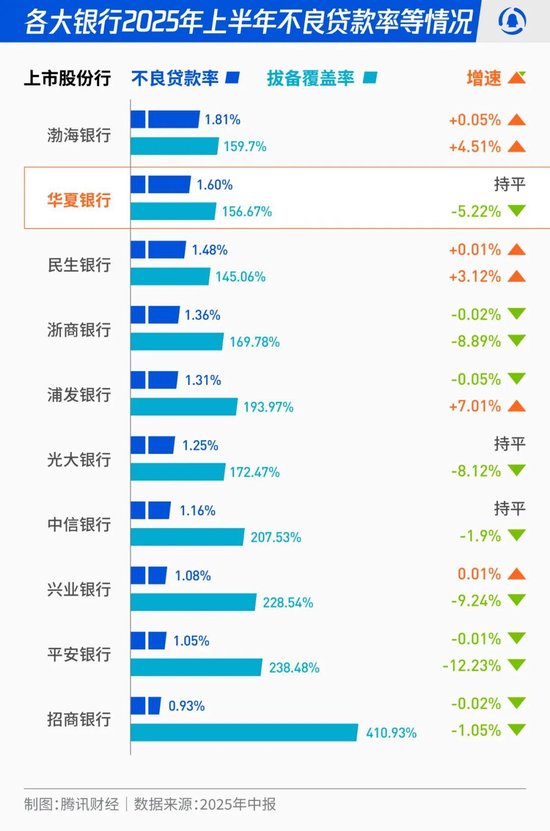 资产质量方面,华夏银行2025年上半年的不良贷款率为1.60%,虽与上年末持平,但在上市股份行中,不良贷款率仅优于渤海银行。