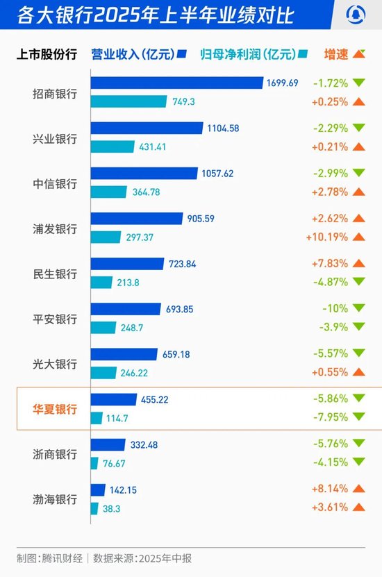 根据华夏银行2025年半年报业绩显示,该行上半年营业收入455.22亿元,同比下降5.86%;利润总额154.85亿元,同比下降8.02%;归属于上市公司股东的净利润114.70亿元,同比下降7.95%。这一业绩增速在10家上市股份制银行中几乎垫底,营业收入增速仅高于平安银行,位列倒数第二;归母净利润增速倒数第一;净息差也同比下降 0.07个百分点至1.54%。