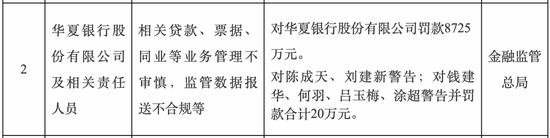 9月5日,金融监管总局开出的一张罚单显示:华夏银行股份有限公司因相关贷款、票据、同业等业务管理不审慎,监管数据报送不合规等问题,被罚款8725万,这也是今年以来银行业开出的最高单笔金额处罚。