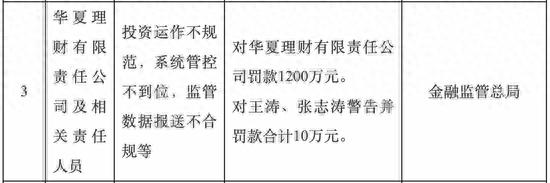 9月12日,华夏银行旗下理财子公司收到金融监管总局一张千万罚单。据官网显示,因投资运作不规范,系统管控不到位,监管数据报送不合规等问题,华夏理财有限责任公司被罚1200万元;相关负责人王涛、张志涛被警告并罚款合计10万元。