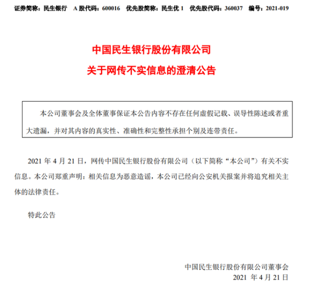 当日收盘后,民生银行紧急发出公告回应,“相关信息为恶意造谣,已经向公安机关报案并将追究相关主体的法律责任。”
