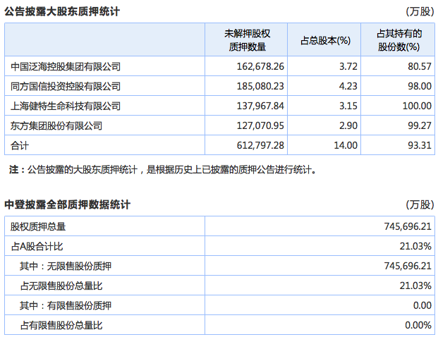 另据万得数据显示,目前,民生银行仍旧有高达14%的股份被大股东质押。其中,中国泛海质押比例占民生银行总股本的3.72%;同方国信质押比例占总股本4.23%;上海健特河东方集团质押股份比例分别占到了3.15%和2.9%。而据中登公司披露的数据显示,民生银行股权质押总数量高达74.57亿股,占A股比例高达21.03%。从去年9月份开始,民生银行被质押的股份占A股流通股的比例就在不断上升。