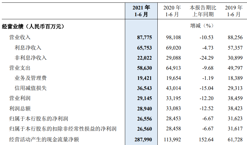 2021年8月30日晚,民生银行公布2021年半年度业绩报告。报告期内,民生银行实现营业收入877.75亿元,同比减少103.33亿元,降幅10.53%;实现归属于本行股东的净利润265.56亿元,同比减少18.97亿元,降幅6.67%。
