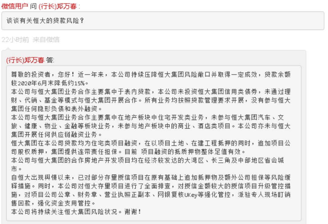 当被投资者要求谈谈有关恒大的贷款风险时,郑万春表示,近一年来,民生银行持续压降恒大集团风险敞口并取得一定成效,贷款余额较2020年6月末降低约15%。他指出,恒大集团在民生银行贷款均为住宅类项目融资,在以项目土地、在建工程抵押的同时,追加项目公司股权质押,集团提供连带责任担保,目前项目融资的抵质押物整体足值有效。
