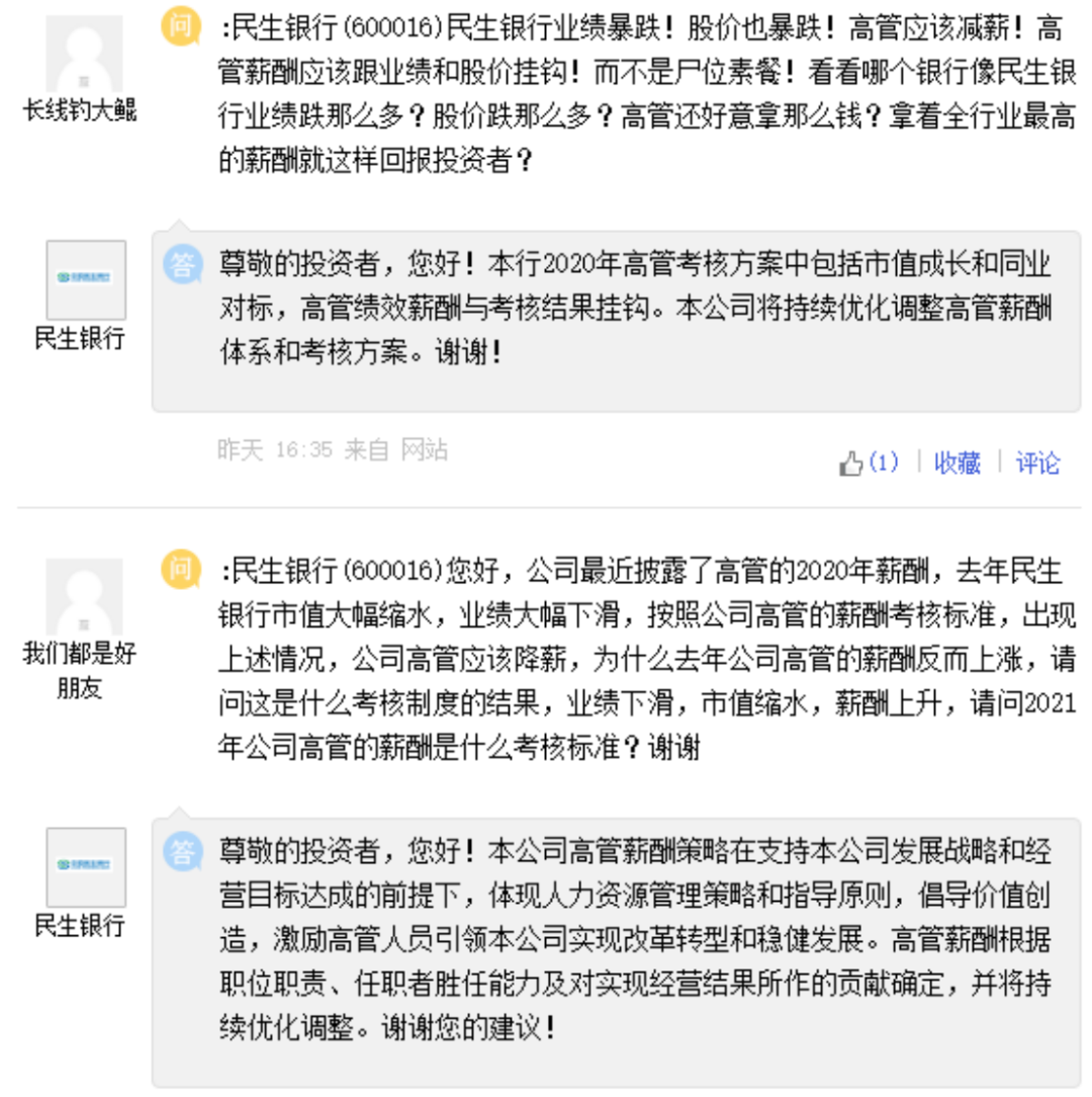 当有投资者提问“民生银行业绩增长全行业垫底,管理层薪资全行业最高,请详细说明合理性在哪里”时,民生银行回应称,该行持续践行市场化薪酬与考核机制,高管薪酬由董事会薪酬与考核委员会根据与经营业绩、市值成长、风险管控等指标挂钩的年度考核结果审议确定。“2020年本公司加大贷款、投资等业务减值准备计提力度,积极推进不良资产处置,主动化解风险,净利润同比下降,相应高管薪酬水平较上年有一定幅度下降。本公司将持续优化绩效考评和激励约束机制,根据高管职位职责、任职者胜任能力及对实现经营结果所作的贡献确定高管薪酬。目前,本公司正在坚定推进专业序列体系建设和岗位定价薪酬改革,通过建立‘因需设岗、以岗定价、岗变薪变、按绩取酬’科学有效的激励制度,聚焦战略重点,持续激发组织和员工的积极性与创造力,改革后高管薪酬将进一步强化与市值成长、风险管控等指标及可比同业情况挂钩。”