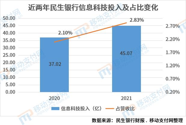 据年报数据显示,2021年,民生银行信息科技投入达45.07亿元,同比增长21.75%,占营收的2.83%;科技人员总数3062人,同比增长16.65%,为民生银行聚焦“民营企业的银行、敏捷开放的银行、用心服务的银行”战略定位提供科技支撑。