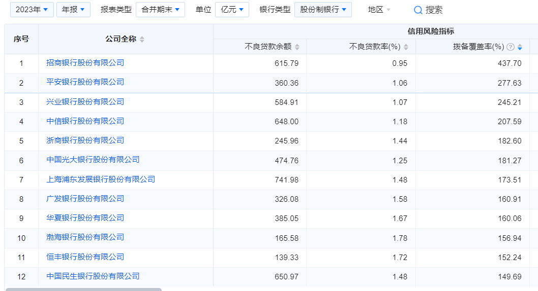 与全国性股份制银行比较来看,民生银行2023年的拨备覆盖率为149.69%,位于12家全国性股份制银行的倒数第一,也低于监管部门要求的拨备覆盖率基本标准的150%。
