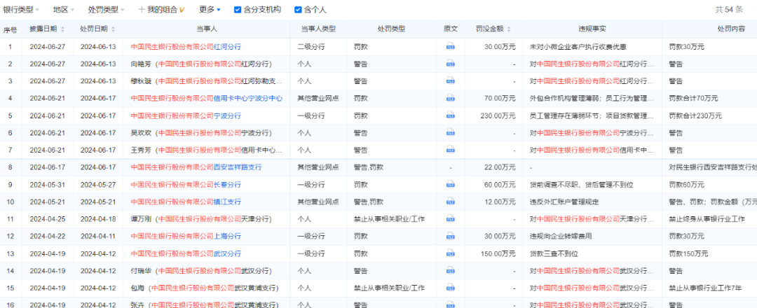 2024年以来,关于民生银行的相关处罚高达54条,共计罚款1242万元,其中单笔罚款金额最高的为国家金融监管总局对中国民生银行股份有限公司宁波分行的罚款230万元,主要违法事实涉及员工管理存在薄弱环节、项目贷款管理不审慎、信贷资金违规流入限制性领域、信贷管理不审慎等方面。从处罚类型来看,信贷业务管理不到位、贷款业务严重违反审慎经营规则是民生银行处罚原因较多的情况,反映出民生银行在贷款业务方面的内控管理及员工审慎经营存在纰漏,这也侧面反应了民生银行在信贷业务方面不良贷款率高于同行的原因。