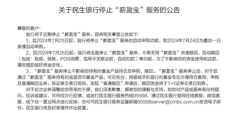 近日,民生银行官网发布公告,自2024年7月26日起,该行将全面停止“薪盈宝”服务。