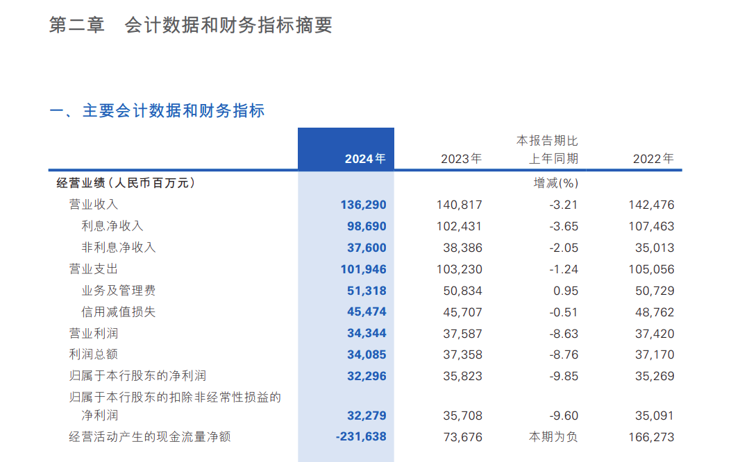 根据该行此前公布的2024年度报告,其去年营业收入1362.90亿元,同比下降3.21%;实现归属于母公司股东的净利润322.96亿元,同比下降9.85%。