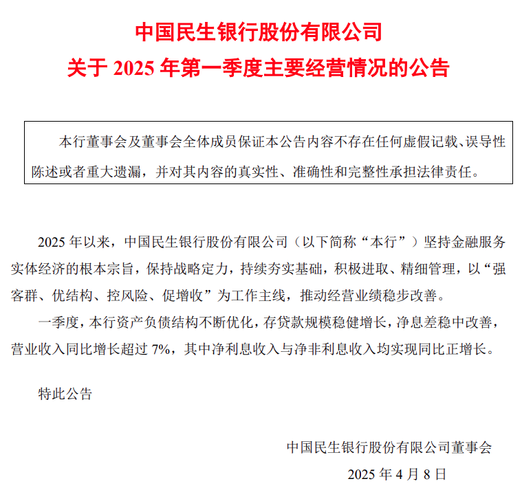 4月8日,中国民生银行股份有限公司(下称民生银行600016.SH)发布《关于2025年第一季度主要经营情况的公告》。