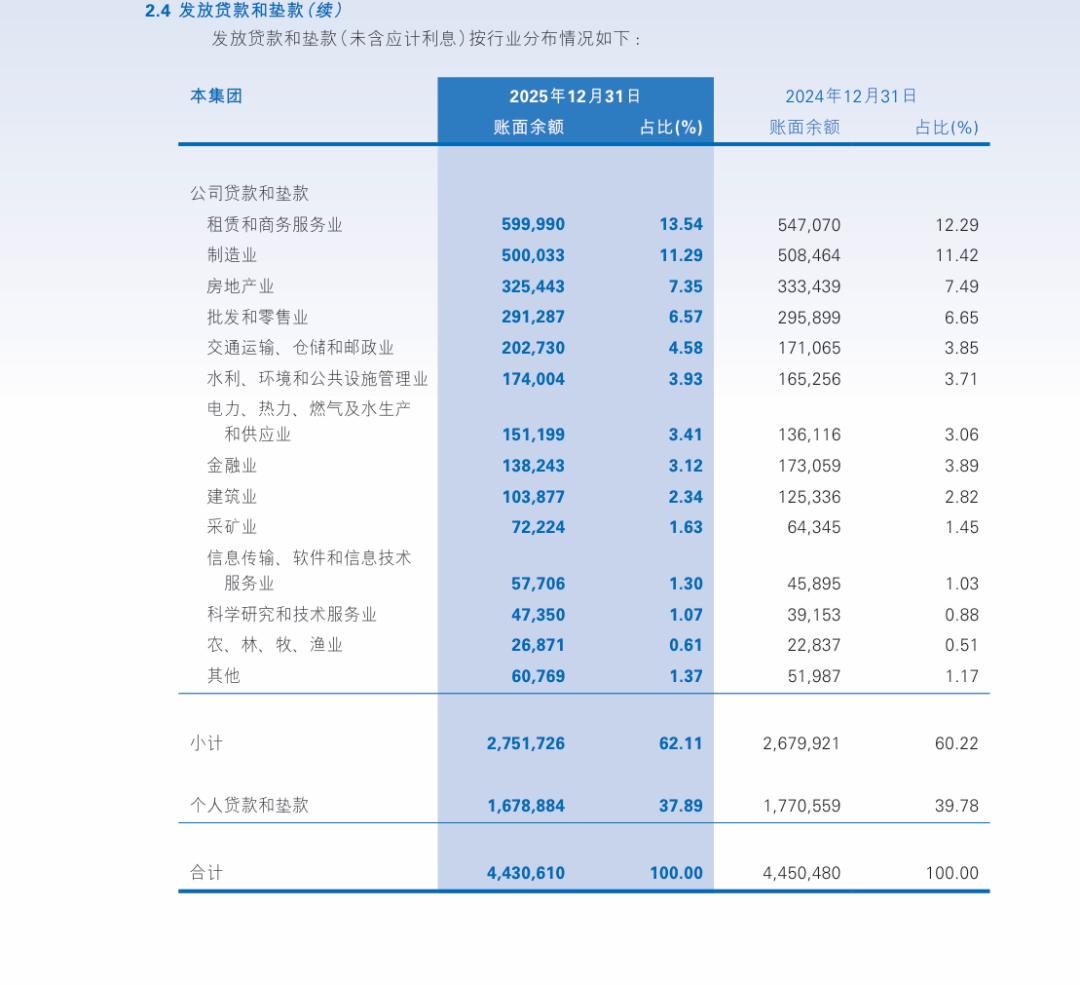 截至2025年末,民生银行在租赁和商务服务业贷款总额5,999.90亿元,比上年末增加529.20亿元;制造业贷款总额5,000.33 亿元,比上年末减少84.31亿元;房地产业贷款总额3,254.43亿元,比上年末减少79.96亿元。
