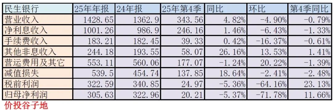 民生银行这个净利润真是啪啪打脸前几年看好民生银行困境反转的大V。自从2020年民生银行归母净利润暴跌36.25%后,连续3年净利润勉强见红,似乎让看好民生银行的投资者看到希望。结果2024,2025连续两年净利润下跌。目前,305.63亿的净利润水平基本回到了2011年279.2亿的水平。从2012年之后民生银行的净利润从没有如此接近300亿。这相当于民生银行的利润水平一下倒退到13年前。记得2012年民生银行利润暴增时,当时的银行大V——XX老股民还写过看好民生银行10年10倍。十几年看好民生银行的大V好几波,前有XX老股民,中间有杠杆搬砖某私募经理,后有叫嚣买银行就买烂银行的天体行者。但是,最终无一例外在民生银行上栽了大跟头。
