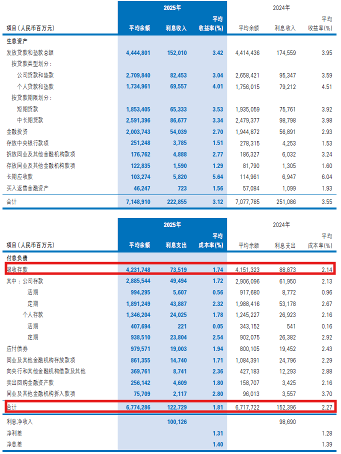 负债端成本整体下降46bps,从2.27%下降到1.81%。其中,存款成本从2.14%下降到1.74%,下降了40bps。活期占比略有提升,从2024年的34.08%提升到2025年的34.62%。
