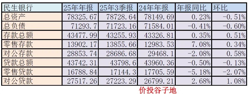 根据2025年年报,民生银行的总资产78325.67亿,同比增长0.23%,总负债71293.7亿,同比下降0.41%。贷款增速-0.5%,存款增速0.35%,更多的数据参考表3: