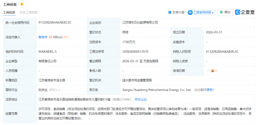 据官网显示,3月31日,江苏淮东石化能源有限公司成立,法定代表人为戴维伟,注册资本为1700万元。