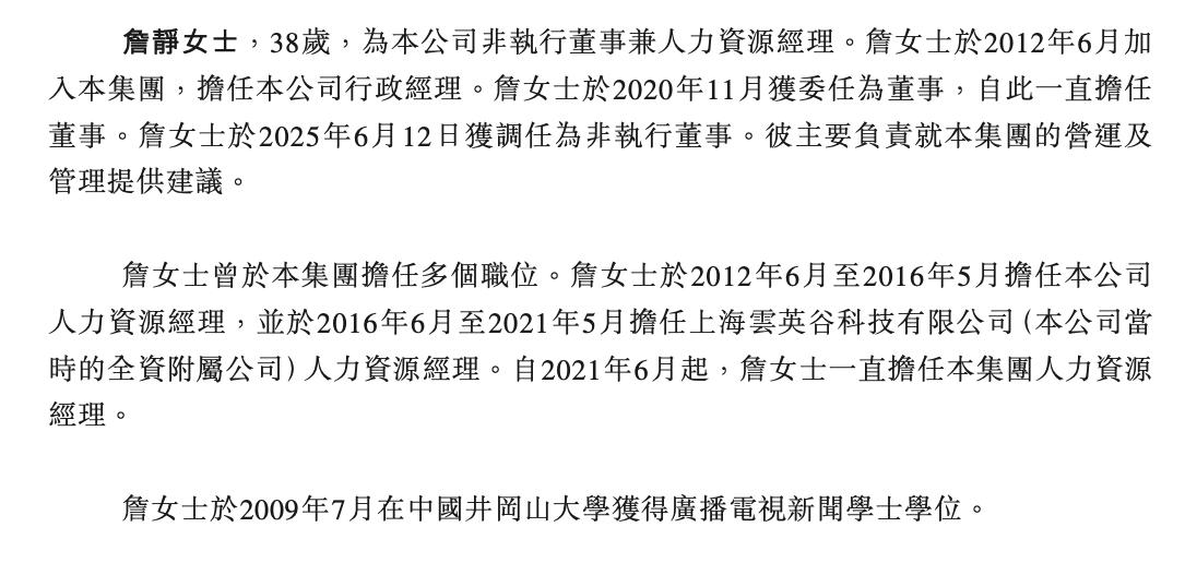 詹静曾于集团担任多个职位。詹静于2012年6月至2016年5月担任公司人力资源经理,并于2016年6月至2021年5月担任上海云英谷科技有限公司(公司当时的全资附属公司)人力资源经理。自2021年6月起,詹静一直担任集团人力资源经理。