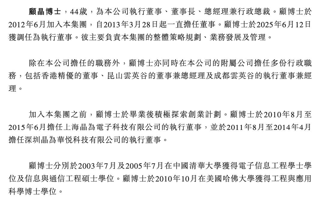 除在公司担任的职务外,顾晶亦同时在公司的附属公司担任多份行政职务,包括香港精优的董事、昆山云英谷的董事兼总经理及成都云英谷的执行董事兼经理。