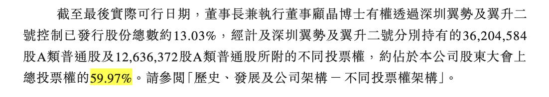 IPO前,董事长兼执行董事顾晶博士有权透过深圳翼势及翼升二号控制已发行股份总数约13.03%,经计及深圳翼势及翼升二号分别持有的36,204,584 股A类普通股及12,636,372股A类普通股所附的不同投票权,约占于公司股东大会上总投票权的59.97%。