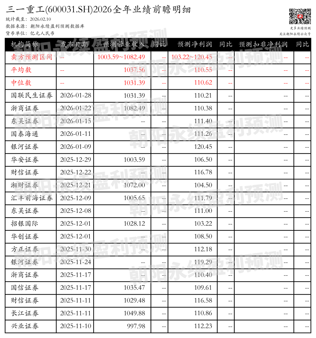 截至2026年02月10日,根据朝阳永续季度业绩前瞻数据: