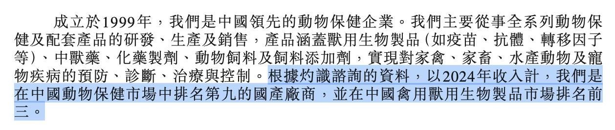 根据灼识谘询的资料,以2024年收入计,公司是在中国动物保健市场中排名第九的国产厂商,并在中国禽用兽用生物制品市场排名前三。