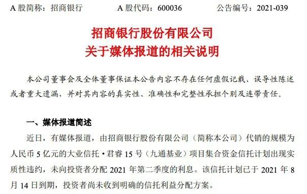 招行随后发布上市公司公告称,招行为君睿15号项目集合资金信托计划的代销机构,该信托计划的产品发行方及主动管理人为大业信托。该信托计划信托资金用于向九通基业投资有限公司提供融资人民币5 亿元。为担保九通基业投资有限公司支付义务的履行,华夏幸福基业股份有限公司提供了不可撤销的连带责任保证担保。该信托计划已于8月16日到期。