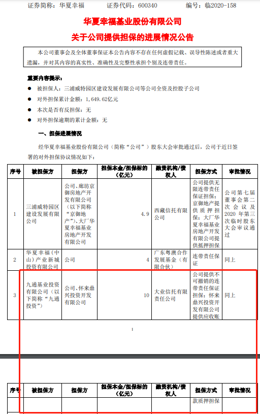 8月16日,招商银行回应,该行代销一笔5亿元信托计划信托资金用于向九通基业投资有限公司提供融资人民币5亿元。为担保九通基业投资有限公司支付义务的履行,华夏幸福基业股份有限公司提供了不可撤销的连带责任保证担保。该信托计划已于 2021 年 8 月 16 日到期。