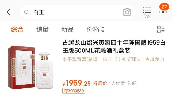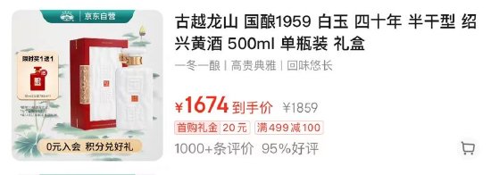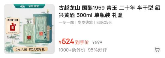 对此,古越龙山近些年来推出不少中高端产品。2019年推出国酿1959白玉、国酿1959青玉两大新品上市,前者单价1959元,后者售价为599元。价格高端的背景下,借助国潮文化吸引新一代年轻群体。但是比较依赖传统的线下渠道,淘宝旗舰店中,国酿1959白玉仅有1人付款。同时,在京东电商平台上,国酿1959白玉、国酿1959青玉的价格均低于指导价格。