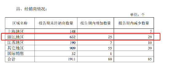 究其原因,或与浙江地区的经销商变动相关。半年报显示,上半年浙江地区经销商数量为632个,增加25个,减少29个,净增加为负。