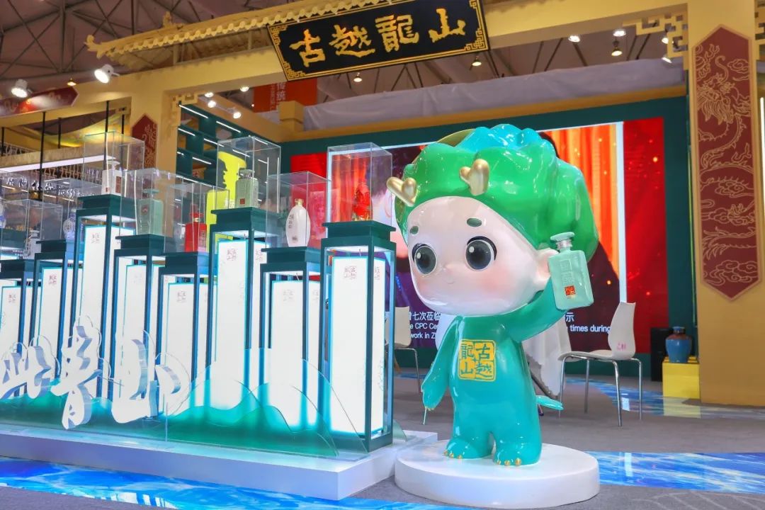 甫入展馆,可爱的古越龙山吉祥物“小青玉”首先映入眼帘。展馆正中的古越龙山主展区,以青绿色为主色调,并饰以宋代名画《千里江山图》的相关元素,展台上陈列的古越龙山高端大单品“只此青玉”十分引人瞩目。