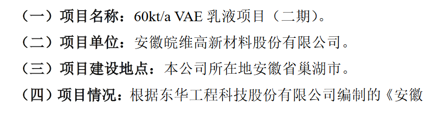 鉴于 VAE 乳液有良好的市场前景,为拓宽产业面,延伸产业链,做强价值链,扩大市场份额,公司决定在现有厂区内已有 60kt/a VAE 乳液项目(一期)基础上,投资新建 60kt/a 高品质的 VAE 乳液(二期)项目。同时,在本项目主框架内建设一套 80 吨/年特殊聚合度高端 VAE 乳液生产线,以满足一些特殊客户的特殊要求。