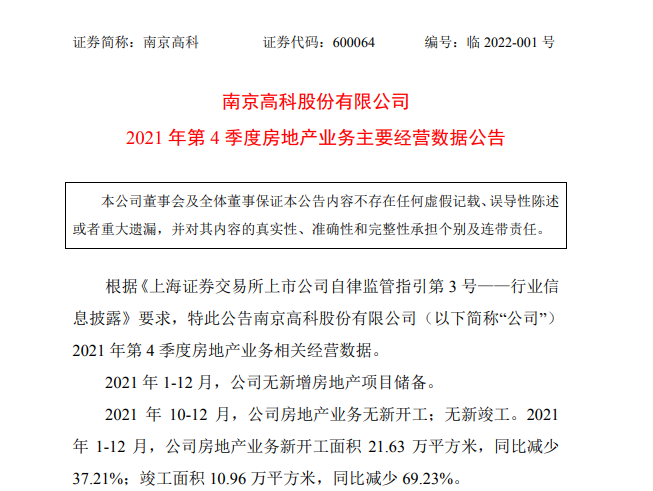 【环球网房产报道】1月14日,南京高科(600064.SH)发布2021年第4季度房地产业务主要经营数据公告。