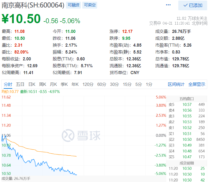 4月21日,截至11:20,南京高科(SH:600064)跌5.06%,现报10.50元,成交额为2.88亿元,总市值为129.78亿元。