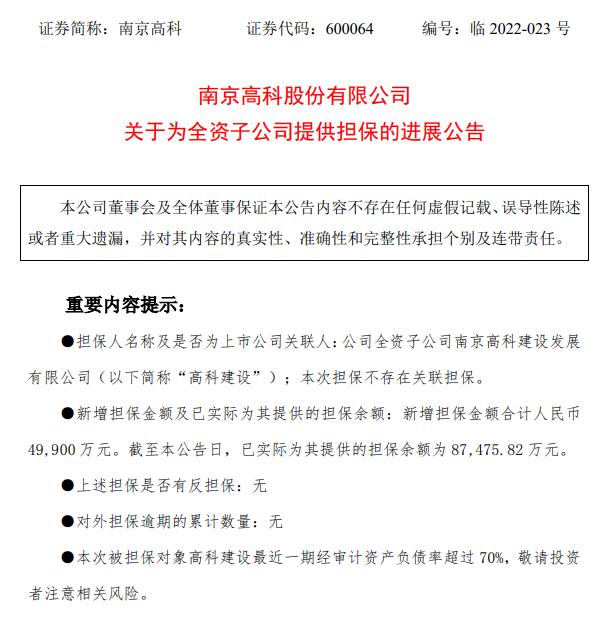 乐居新媒体南京讯日前乐居新媒体获悉,南京高科股份有限公司发布《关于为全资子公司提供担保的进展公告》。公告显示,南京高科为全资子公司南京高科建设发展有限公司提供49900万元的担保。