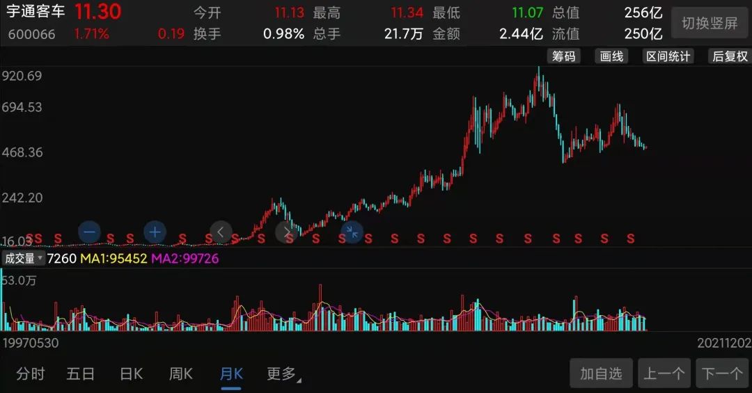 1997年5月8日宇通登陆上海主板,发行价9.75元,首日开盘价30元。为剔除分红送股的影响,这里采用后复权股价计算,到1999年3月3日最低触及16.03元,然后就一路涨到了2017年11月13日的最高920.69元,较发行价大涨93倍、较首日开盘价大涨29倍、较1999年3月最低价涨了56倍,市值也达到历史最高592亿。