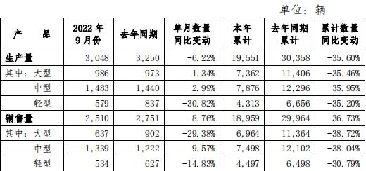 宇通客车10月10日公告,公司9月销量2510辆,同比下滑8.76%;前9月销量1.9万辆,同比下滑36.73%。