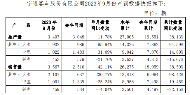 近日,宇通客车股份有限公司(简称“宇通客车”)董事会发布2023年9月份产销数据快报。数据显示,2023年9月宇通客车销售客车3,567辆,同比增长42.11%;2023年1-9月宇通客车累计销售客车26,275辆,同比增长38.59%。