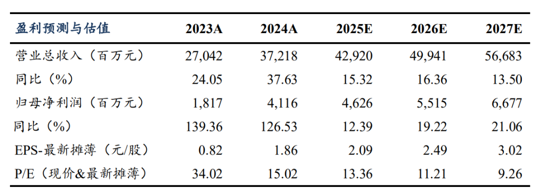 我们维持公司2025~2027年营业收入预测为429/499/567亿元,同比+15%/+16%/+14%,维持2025~2027年归母净利润为46.3/55.2/66.8亿元,同比+12%/+19%/+21%,对应PE为13/11/9倍,维持“买入”评级。