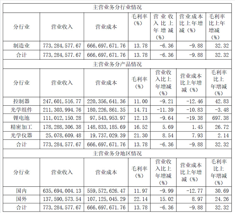公司业务主要包括光学产品、智能控制器和锂电芯产品的